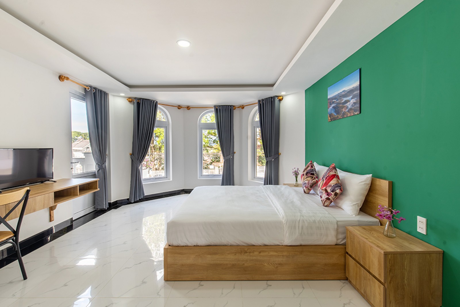- - PHÒNG NGỦ SAU: 1 giường Queen size, Bàn trang điểm, Smart TV, Quạt, Tủ quần áo, khăn,..